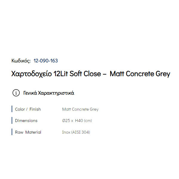 Pam Matt Concrete Grey 12-090-163 Δοχείο Απορριμμάτων Κουζίνας 12 Lt
