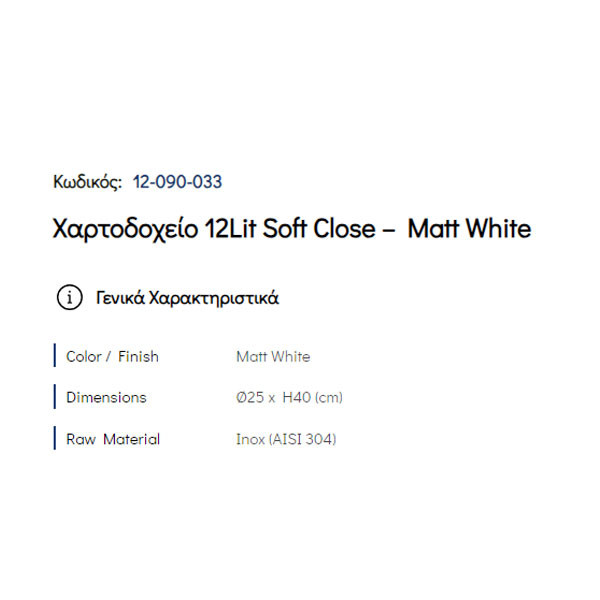 Pam Matt White 12-090-033 Δοχείο Απορριμμάτων Κουζίνας 12 Lt