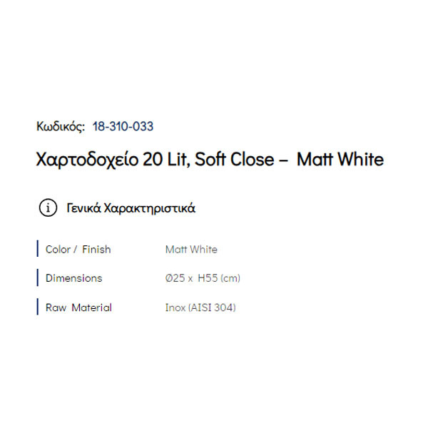 • Δοχείο απορριμμάτων μεταλλικό από ανοξείδωτο χάλυβα Inox (AISI 304) και ηλεκτροστατική βαφή