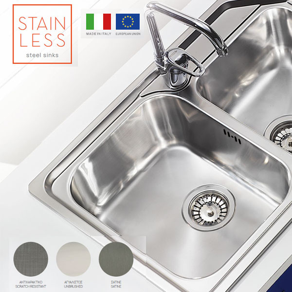 • Ένθετος νεροχύτης από ανοξείδωτο ατσάλι 18 / 10 πάχους 0.7 mm, σατινέ λείος ή αντιχαρακτικός με επιλογή