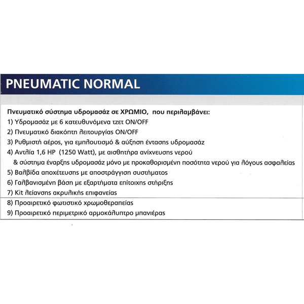 • H μπανιέρα Monica 170 διατίθεται και με σύστημα υδρομασάζ πνευματικό (Pneumatic Basic) ή (Pneumatic Normal) με επιλογή