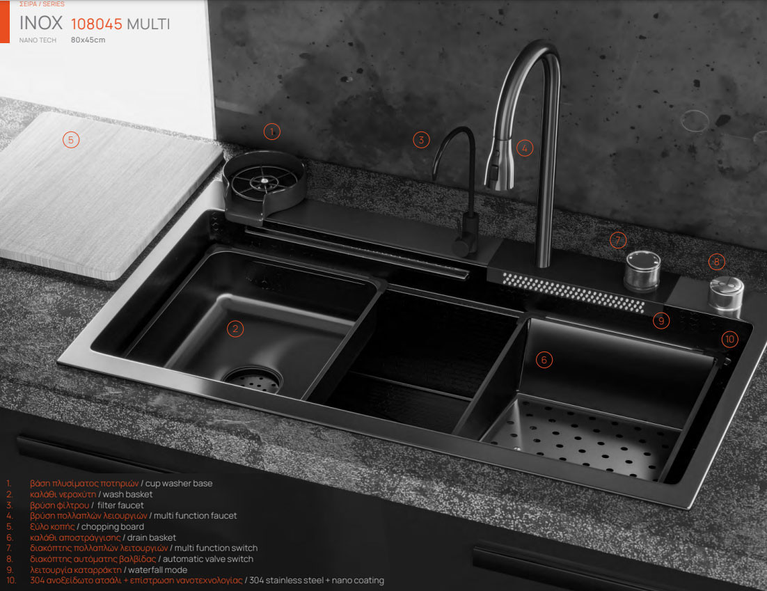 • Ένθετος νεροχύτης από ανοξείδωτο ατσάλι 304 και επίστρωση νανοτεχνολογίας, με σατινέ λεία επιφάνεια, σε gun metal