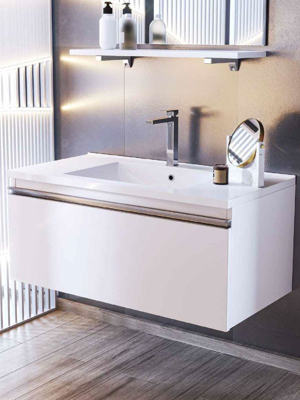 • Πάγκος κρεμαστός με ένα ντουλάπι και ένα μεγάλο συρτάρι (με αργό κλείσιμο), σε λευκό Laminate