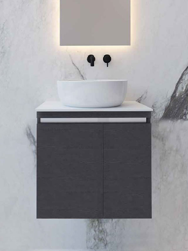 • Πάγκος κρεμαστός με δύο πορτάκια soft close (αργό κλείσιμο), από M.D.F με επένδυση laminate, σε χρώμα grizio grafite