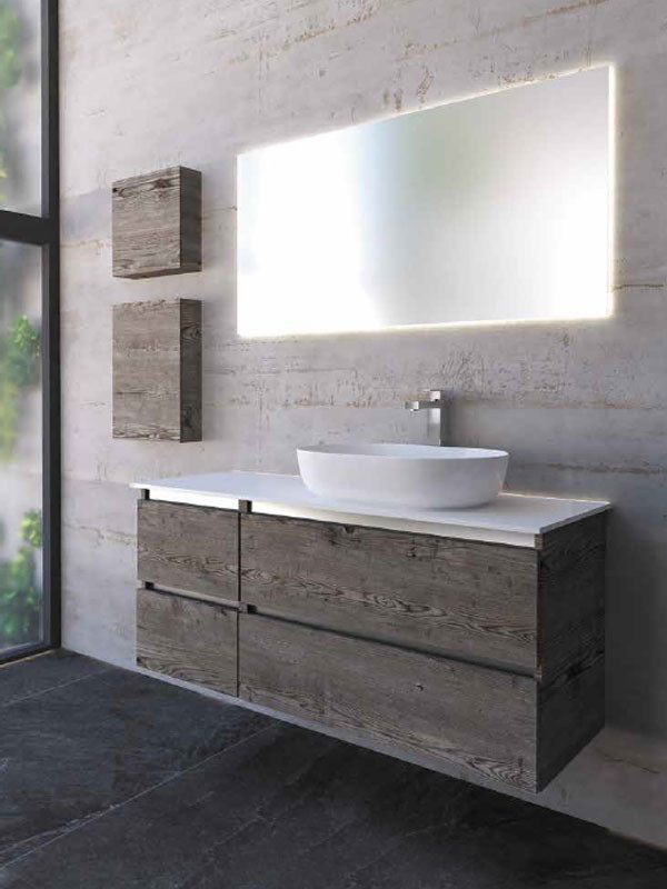 • Πάγκος κρεμαστός με τέσσερα συρτάρια soft close (αργό κλείσιμο), από M.D.F με επένδυση laminate, σε χρώμα smokey grey