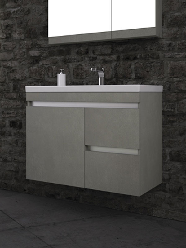 • Πάγκος κρεμαστός 41328 με τρεις αποθηκευτικούς χώρους, ένα ντουλάπι με ένα ράφι και ένα πορτάκι, δύο συρτάρια, με μηχανισμούς soft close (αργό κλείσιμο), από M.D.F 16 mm με επένδυση laminate, σε χρώμα 8763 Cemento