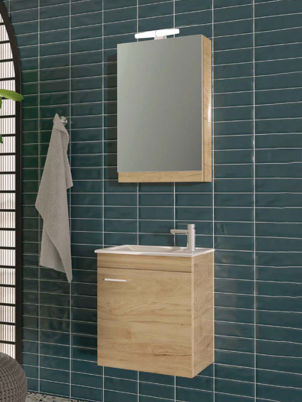 • Καθρέπτης Nireas 8845 κρεμαστός, κρυφοντούλαπο με ένα πορτάκι soft close (αργό κλείσιμο) και δύο ράφια, από M.D.F 16 mm με επένδυση laminate, σε χρώμα 8086 Light Hickory