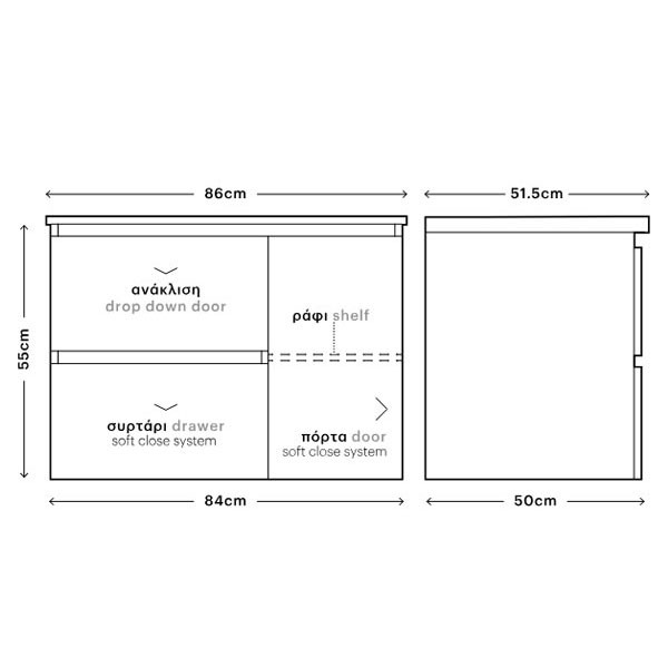 • Διάσταση (Μ x Π x Υ): 84 x 50 x 55 cm