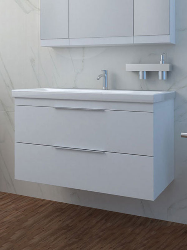 • Πάγκος κρεμαστός 3632 με δύο αποθηκευτικούς χώρους, δύο συρτάρια με μηχανισμούς soft close (αργό κλείσιμο), από M.D.F 16 mm σε χρώμα 9102 λευκή γυαλιστερή λάκα