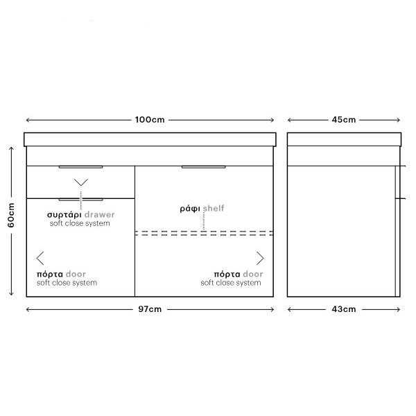 • Διάσταση (Μ x Π x Υ): 97 x 43 x 60 cm