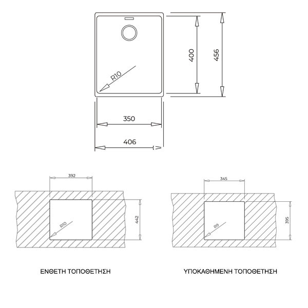 • Κοπή πάγκου: 39,2 X 44,2 cm