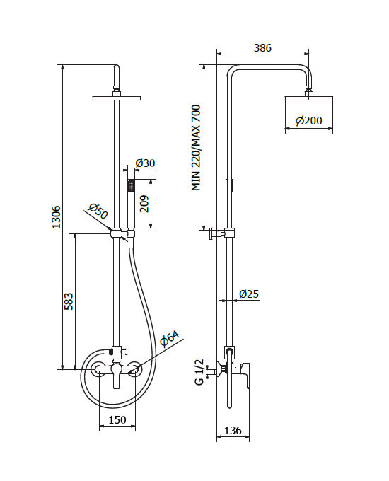 • Κολώνα ντους 2 εκροών, ύψους 130 cm από την στάθμη της μπαταρίας
