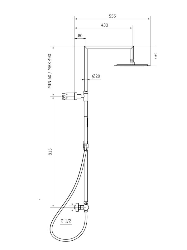 • Κολώνα ντους ανοξείδωτη 2 εκροών ρυθμιζόμενου ύψους 87,5 - 130,5 cm, από την στάθμη της μπαταρίας