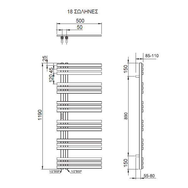 Θερμαινόμενη πετσετοκρεμάστρα από ανοξείδωτο χάλυβα AISI 304, για υδραυλική ή ηλεκτρική λειτουργία